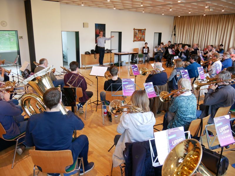 Landesposaunenwart KMD Christian Kornmaul dirigiert: Probe für das Landesposaunenfest mit Welturaufführung.