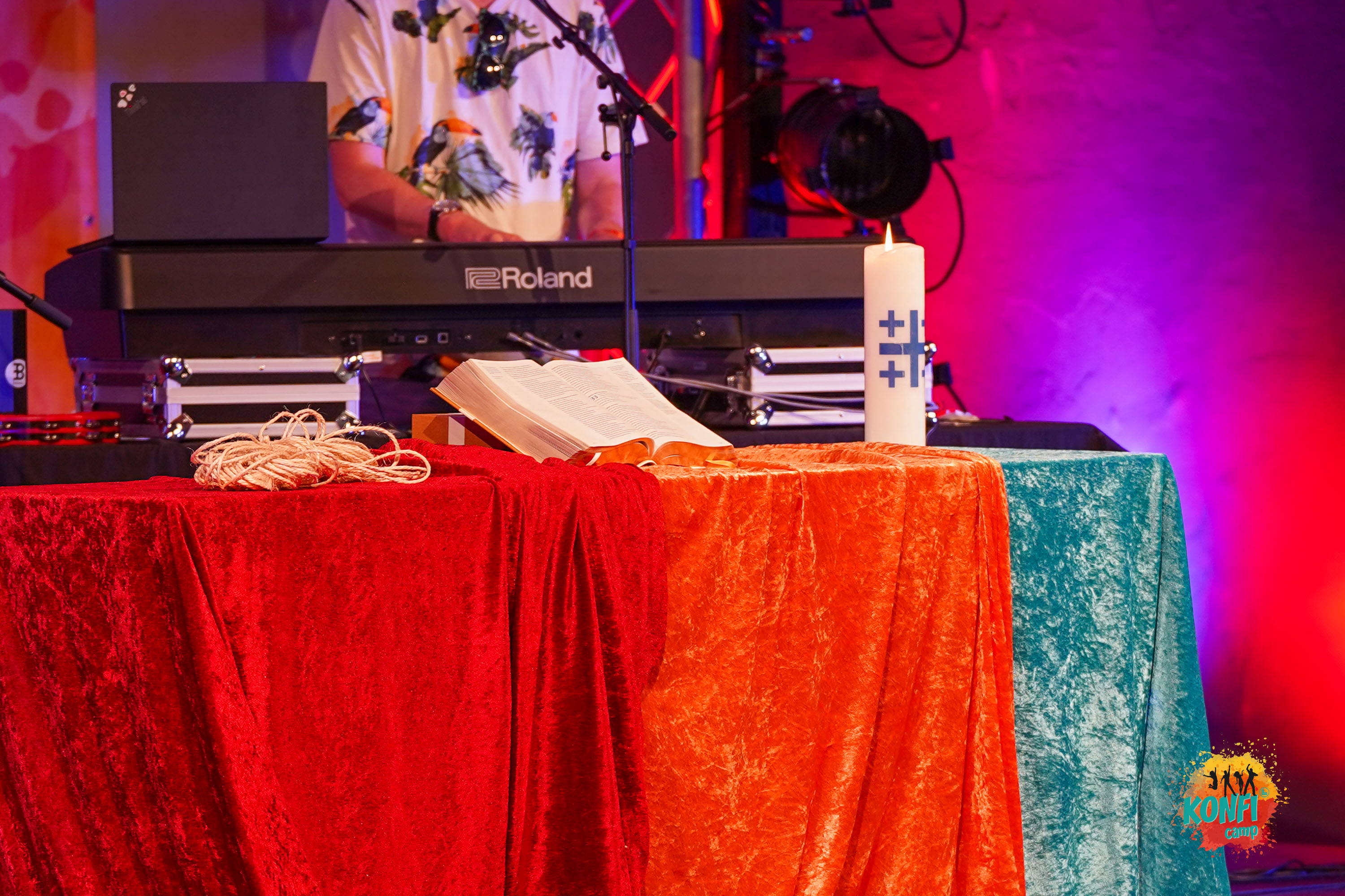 Gerahmt wird das Programm des Konficamps von der gemeinsamen Feier der Tagzeitengebete, im Plenum. Vormittags mit dem inhaltlichen Schwerpunkt des Tages, mit anschließenden Arbeitsphasen in sogenannten Homegroups, den Gemeindegruppen. Konfis und Mitarbeitende vertiefen in einem konzentrierten Rahmen die inhaltlichen Themen, bevor sie mit dem Mittagssegen einen gemeinsamen Abschluss finden. Nachmittags stehen Workshopangebote, die von Mitarbeitenden der Gemeinden durchgeführt werden, auf dem Programm.  Ergänzt durch freie Zeit am Badesee sowie Sport- und Spielangebote auf dem Gelände. Das abendliche Mitmachprogramm, mit ausgeprägtem Show- und Partycharakter bot Konfis und Teamern gemeindeübergreifend die Möglichkeit,  miteinander in Kontakt zu kommen. Darüber hinaus wurde auch die eine oder andere „Rampensau“, insbesondere unter den Hauptamtlichen, von der Leine gelassen. Einen ruhigen und besinnlichen Abschluss fand der Tag in der Feier des gemeinsamen Abendsegens. Durchgeführt von Ehrenamtlichen, mit Bezug auf das inhaltliche Thema des Tages. Somit erlebten die Teilnehmenden jeden einzelnen Tag, mit den unterschiedlichen Elementen, thematisch als runde Sache.
