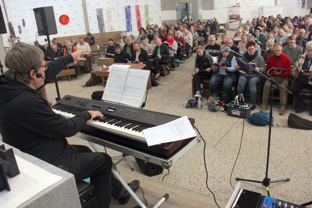Unter der Leitung von Kantor Gregor Schwarz probten in der katholischen Kirche Heilig Geist rund 220 Sängerinnen und Sänger. Projektleiterin Stefanie Brenzel vom Veranstalter, der Stiftung Creative Kirche (Witten), war angetan von der Kirche und ihrer Akustik, der guten Stimmung und den „tollen Sängerinnen und Sängern“.