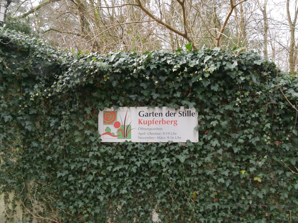 Zu sehen ist eine Mauer, die mit Efeu bewachsen ist. Darauf ein Schild, auf dem Garten der Stille steht.