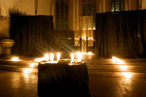 Ein Kerzenweg führte durch den beiseite gezogenen Vorhang zum Abendmahltisch im Chorraum.