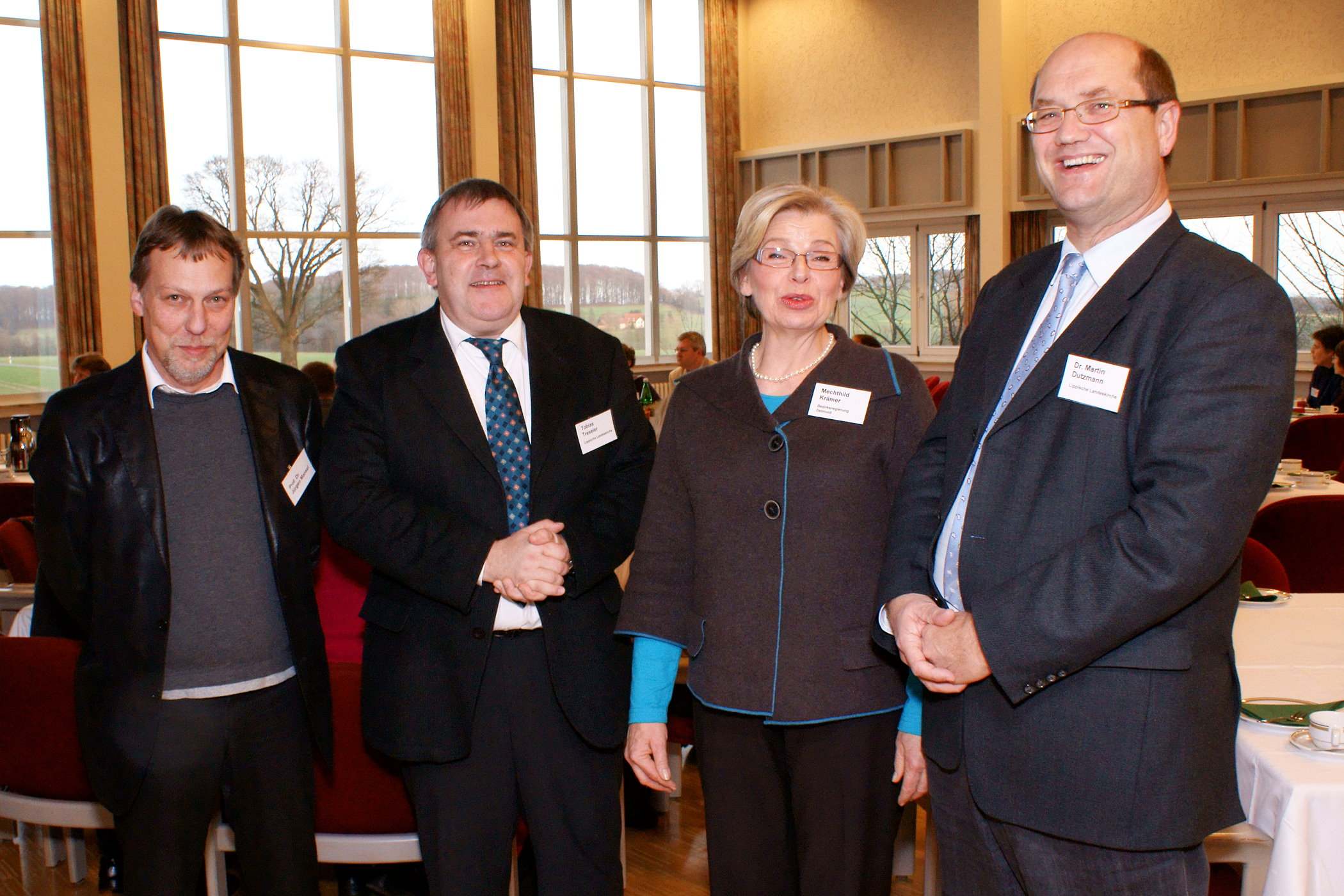 Landessuperintendent Dr. Martin Dutzmann (rechts) und Landespfarrer Tobias Treseler (2. von links) begrüßten Prof. Dr. Jürgen Mansel (links) und leitende Regierungsschuldirektorin Mechthild Krämer auf dem Schulleiterbegegnungstag.
