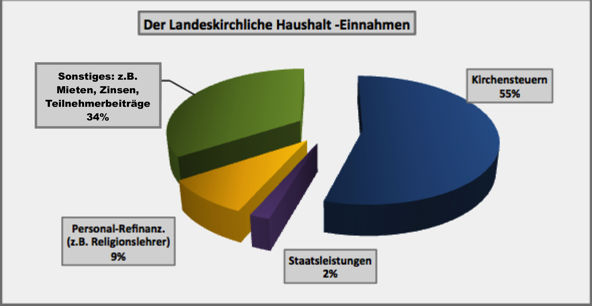 Die Kirchensteuer, größter Einnahmeposten, beträgt neun Prozent der Lohn- und Einkommensteuer. Über das staatliche Einzugsverfahren gelangt die Kirchensteuer direkt an die Landeskirche. Diese zahlt dem Staat für seine Dienstleistung drei Prozent des Kirchensteueraufkommens. Eine spezielle Form der Kirchensteuer ist das besondere Kirchgeld.