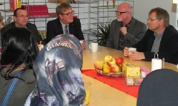 „Da die Lippische Landeskirche stark in der Flüchtlingsarbeit engagiert ist, wollte ich die Woche des Respekts zum Anlass nehmen erneut eine Einrichtung der Flüchtlingsarbeit zu besuchen und damit auch den Menschen dort meinen Respekt zu zollen“, so Arends. Er sitzt mit Erziehern, mit Mädchen und Jungen, mit Heiko Schuhmacher und Dirk Pruin von der Fürstin-Pauline-Stiftung sowie Matthias Neuper für das landeskirchliche Diakoniereferat und die Stiftung Herberge zur Heimat rund um einen großen Tisch. Er erfährt, dass im Clearinghaus junge Männer unter 18 leben, die ohne Begleitung nach Deutschland gekommen sind. Aus Anlass des Besuchs sind heute aber auch Mädchen aus der Mädchenwohngruppe in Lemgo da.