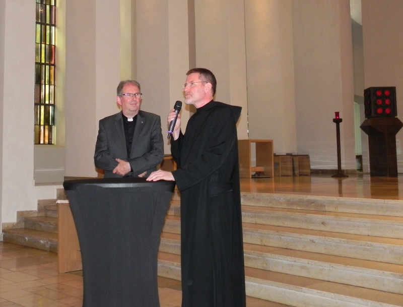Dabei müsse Kirche sich darauf einlassen, dass sie nicht mehr das alleinige Sinn- und Deutungsmonopol habe. Ein Weg sei es, die anderen Religionen verstehen zu lernen, um das Eigene neu zu entdecken. „Die Werkzeuge, die wir einsetzen, sind nicht mehr die richtigen“, so der Pater weiter, der auch gelernter Kunstschmied und in der Benediktinerabtei Prior und Wirtschaftsleiter ist: „Religion entwickelt sich ins Individuelle, ins Private“. So konnte er von der Erfahrung berichten, dass ein persönlicher Segen auf ein in der Kunstschmiede hergestelltes Kreuz die Menschen besonders berühre: „Wir brauchen heute kleinere Gruppen und zartere Werkzeuge.“ Kirche sei ein Ort der Erlösung, zeigten sich Dechant Norbert Nacke und Pater Abraham Fischer in ihrem Dialog einig: „Das Lächeln Gottes sollten wir weiterschenken.“ Ein Lächeln auf das Gesicht der Gäste zauberte passend dazu der von Kantor Gregor Schwarz an der Orgel und Willi Budde am Kornett gestaltete musikalische Rahmen mit eingängigen Werbemelodien im klassischen Gewand.