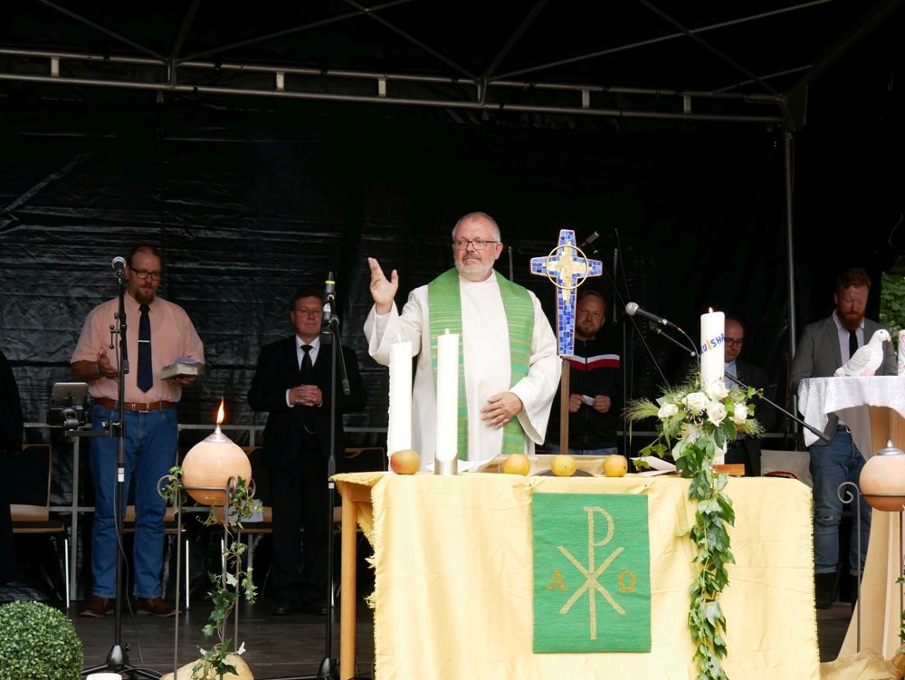 Der Gottesdienst, der verschiedene Frömmigkeitsstile vereinte, wurde musikalisch von Maria Gavrish am Piano, dem Lobpreischor der E.L.I.A.-Gemeinde und dem Kirchenchor der Neuapostolischen Kirche auf der Bühne untermalt. Im tänzerischen Anspiel verdeutlichten Jugendliche die befreiende Kraft des Glaubens. Die Botschaft der Predigt veranschaulichte Pastor Günter Loos und ein Team der methodistischen Gemeinde in einer Talkrunde, in der eine sprechende Handpuppe zu Wort kam. Es ging um den Ursprung der Taufe und um den Bericht über den äthiopischen Beamten Josephus, der sich laut Bibel spontan taufen ließ: „Egal, wie alt du bist, wo du bist und aus welchem Land du kommst, jeder der ein Freund Jesu sein will und zur Kirche gehören möchte, kann getauft werden. Die Taufe vereint die Christen weltweit.“