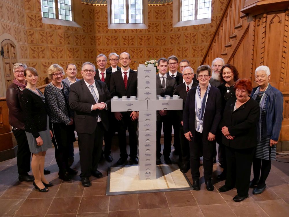Die Delegierten der elf Gründungsmitglieder erbauten als Symbol der Einheit in Christus ein Kreuz aus Steinen mit dem Namen ihrer jeweiligen Gemeinde und unterzeichneten die Satzung der ACK im Stadtgebiet Bad Salzuflen.