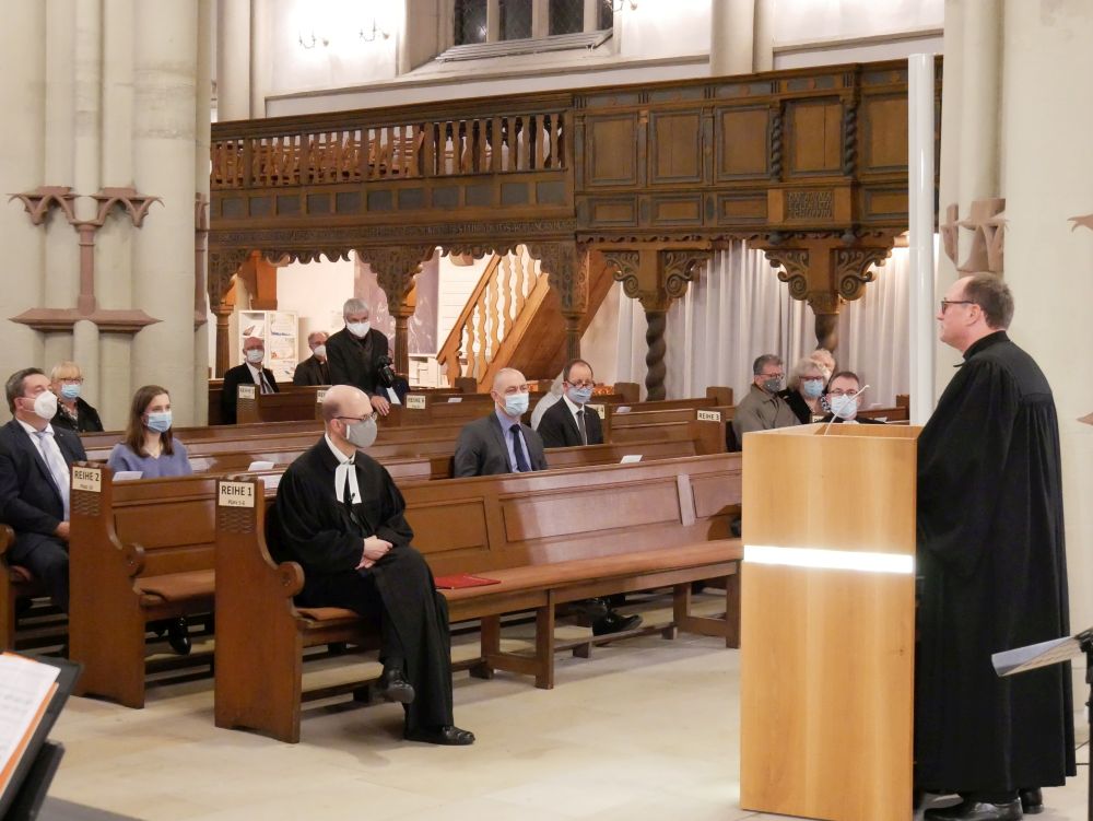 Superintendent Dr. Andreas Lange würdigte in seiner Predigt die stolze Geschichte der Kirche. Nonnen des Klosters Lahde, die nach Lemgo zogen, hätten das größte Bauprojekt Lemgos im 14. Jahrhundert vollendet. „Welch Freude ist es, in dieser Kirche Konzerte zu hören und Gottesdienste zu feiern.“ Lange erinnerte an die Namenspatronin Maria. Maria sei eine menschliche Identitätsfigur und in der Volksfrömmigkeit sehr beliebt. In Grußworten erfuhr St. Marien weitere Würdigung: Landrat Dr. Axel Lehmann betonte den Halt, den Glaube und Kirche in Krisenzeiten geben können, Bürgermeister Markus Baier hob die kulturelle Bereicherung der Stadt durch St. Marien hervor und Landessuperintendent Dietmar Arends die ökumenische Perspektive der Geschichte der Kirche – am 31. Oktober sei Reformationstag gefeiert worden und einen Tag später 700 Jahre St. Marien: „Die Geschichte, in die wir hineingestellt sind, ist immer größer als die eigene Geschichte und hat eine ökumenische Tradition. Letztlich leben wir gemeinsam in der einen Kirche Jesu Christi“.