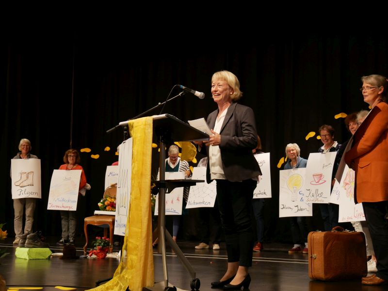 Brigitte Fenner, Pfarrerin für Frauenarbeit der Lippischen Landeskirche, hielt die Andacht. Das Motto des Nachmittags „Der Mensch plant seinen Weg, aber Gott lenkt seine Schritte.“ (Sprüche 16,9) irritiere viele, so Brigitte Fenner, da es schwerfalle, das Heft aus der Hand zu geben und Gott zu vertrauen. Wer Gott als allmächtigen Lenker verstehe, müsse sich jedoch fragen, ob man ihm nicht auch Misserfolge zuschreiben müsse. Nach dem Alttestamentler Frank Crüsemann deuteten biblische Erzählungen Katastrophen als Folge menschlichen Fehlverhaltens. Die Umkehr werde dann als Heil beschrieben. „Gott lenkt, indem er zur Umkehr ruft und befreit.“ Gott mache nicht alles selbst von oben herab, sondern rufe Menschen zum Aufbruch, begleite sie durch die Wüste auf dem Weg in die Freiheit. Gehen müsse man aber selbst.